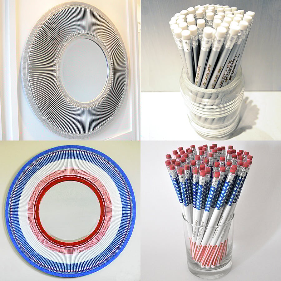 STARS AND STRIPES (SOLD). Mosaiced frame is 10.5" wide and made with hand cut red and blue vitreous glass tiles, red and blue glass seed beads, chained crystal rhinestone (imported from The Czech Republic) and 231 stars and stripes pencils (with ASSEMBLED IN CANADA printed on each one).